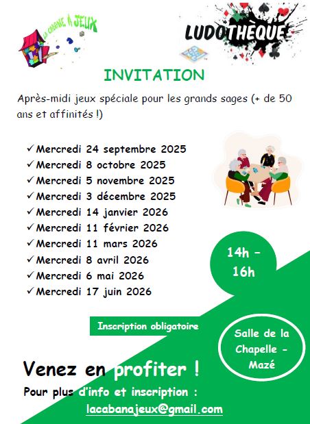 RDV spécial à la salle de la Chapelle de Mazé pour les personnes de plus de 50 ans et affinité, sur réservation.